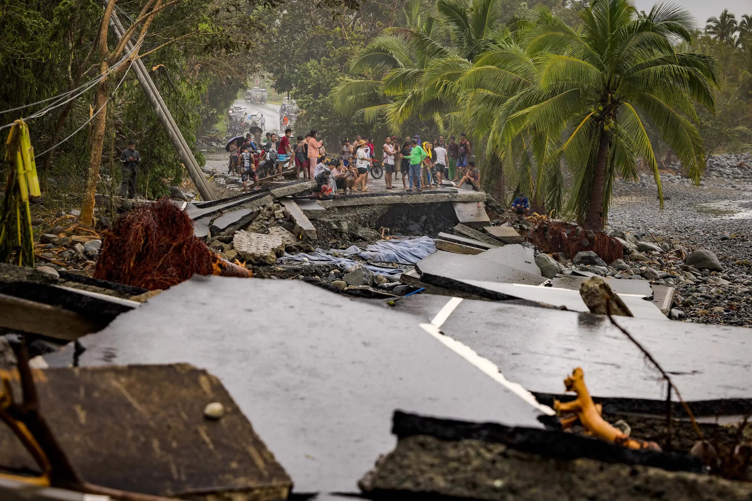 Obyvatelé si prohlížejí silnici zničenou přívalovými vlnami způsobenými supertajfunem Fung-wong v obci Dipaculao v provincii Aurora na Filipínách, 10. listopadu 2025. (Ezra Acayan / Getty Images)