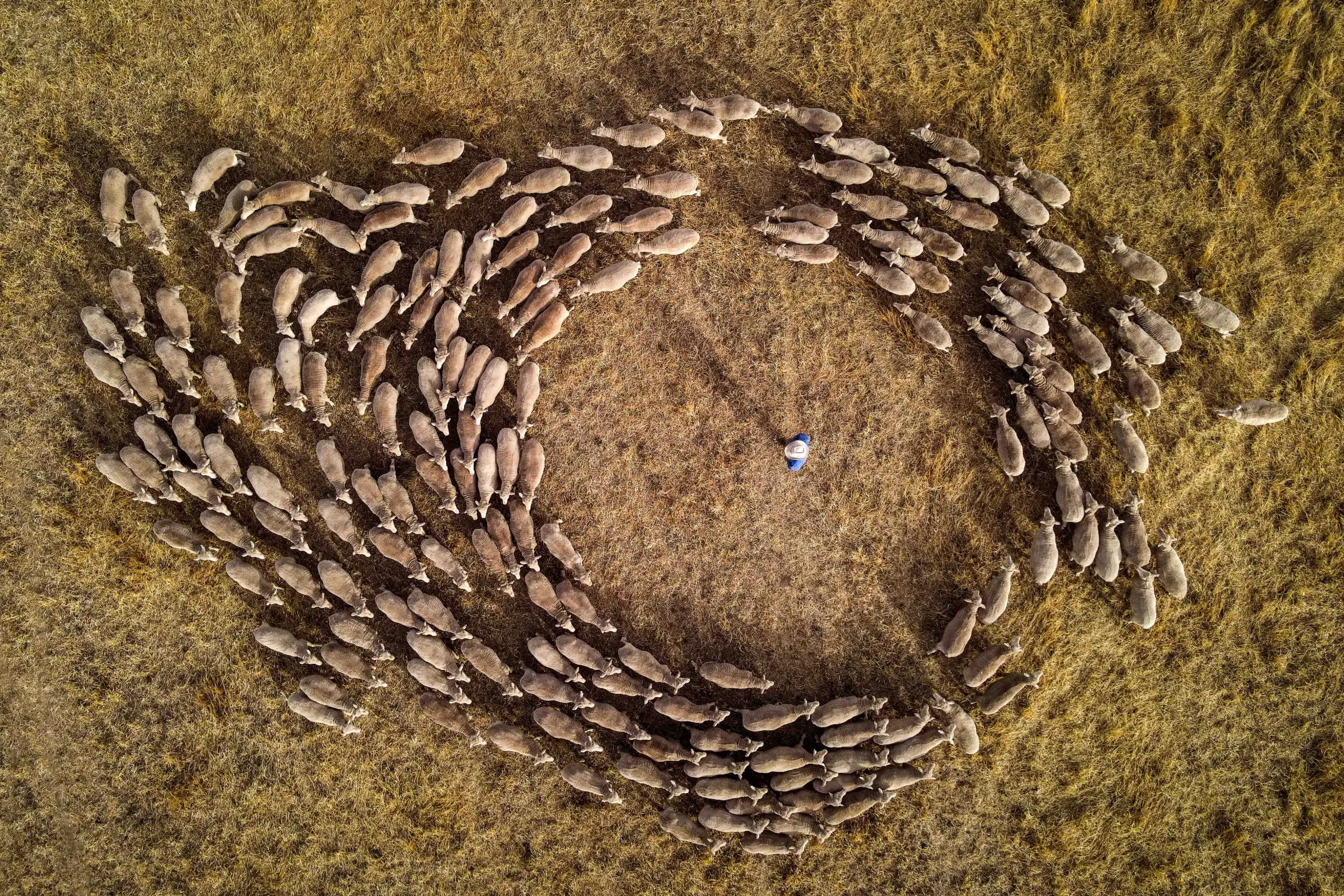 Australský farmář Ian Gardiner je obklopen ovcemi, zatímco pomocí psů řídí jejich přesun na svém pozemku poblíž města Gunnedah v severní části Nového Jižního Walesu, 13. listopadu 2025. (David Gray / AFP via Getty Images)