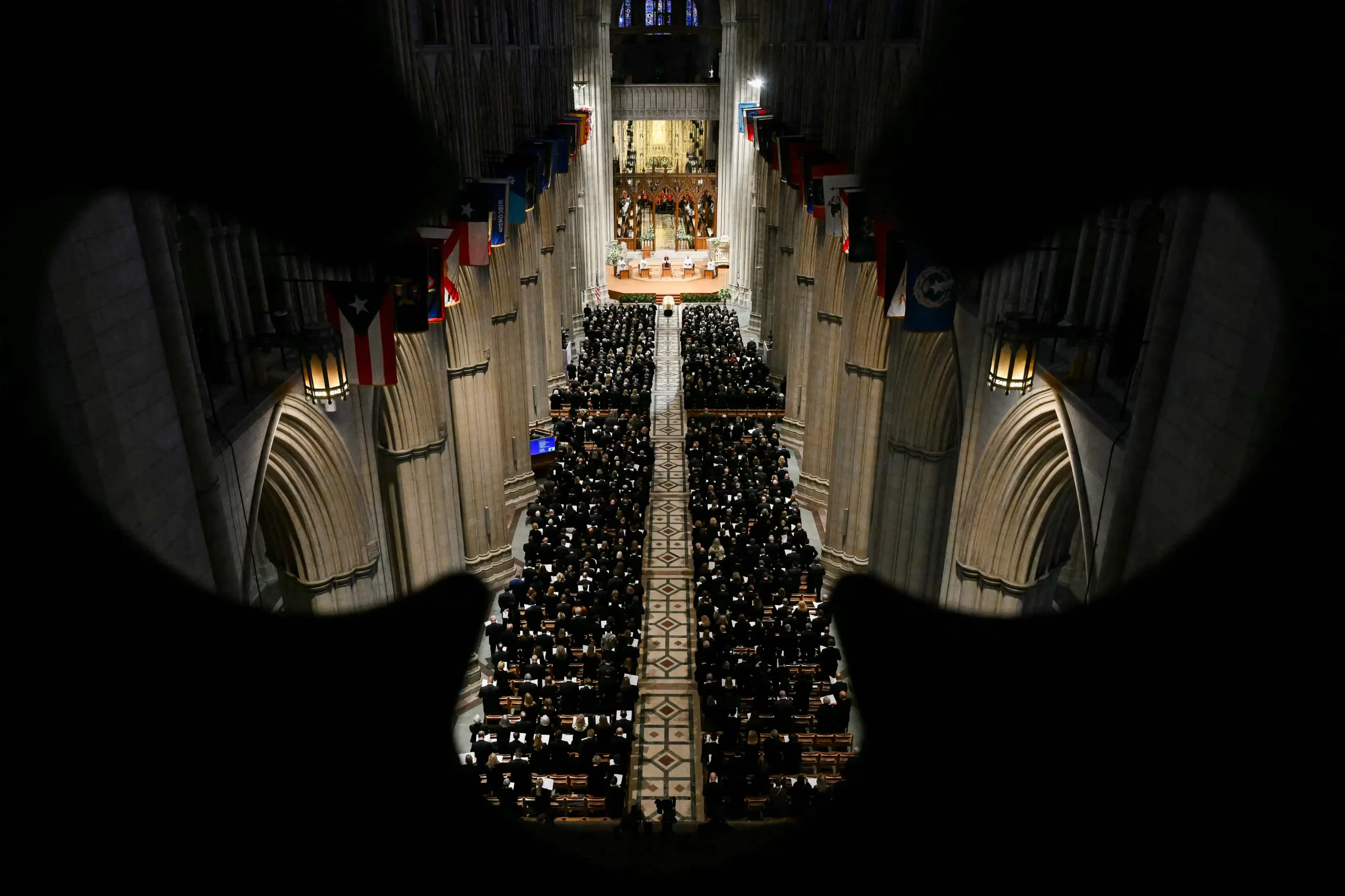 Celkový pohled na katedrálu během pohřebního obřadu zesnulého viceprezidenta Dicka Cheneyho ve Washington National Cathedral ve Washingtonu, 20. listopadu 2025. (Saul Loeb / AFP via Getty Images)