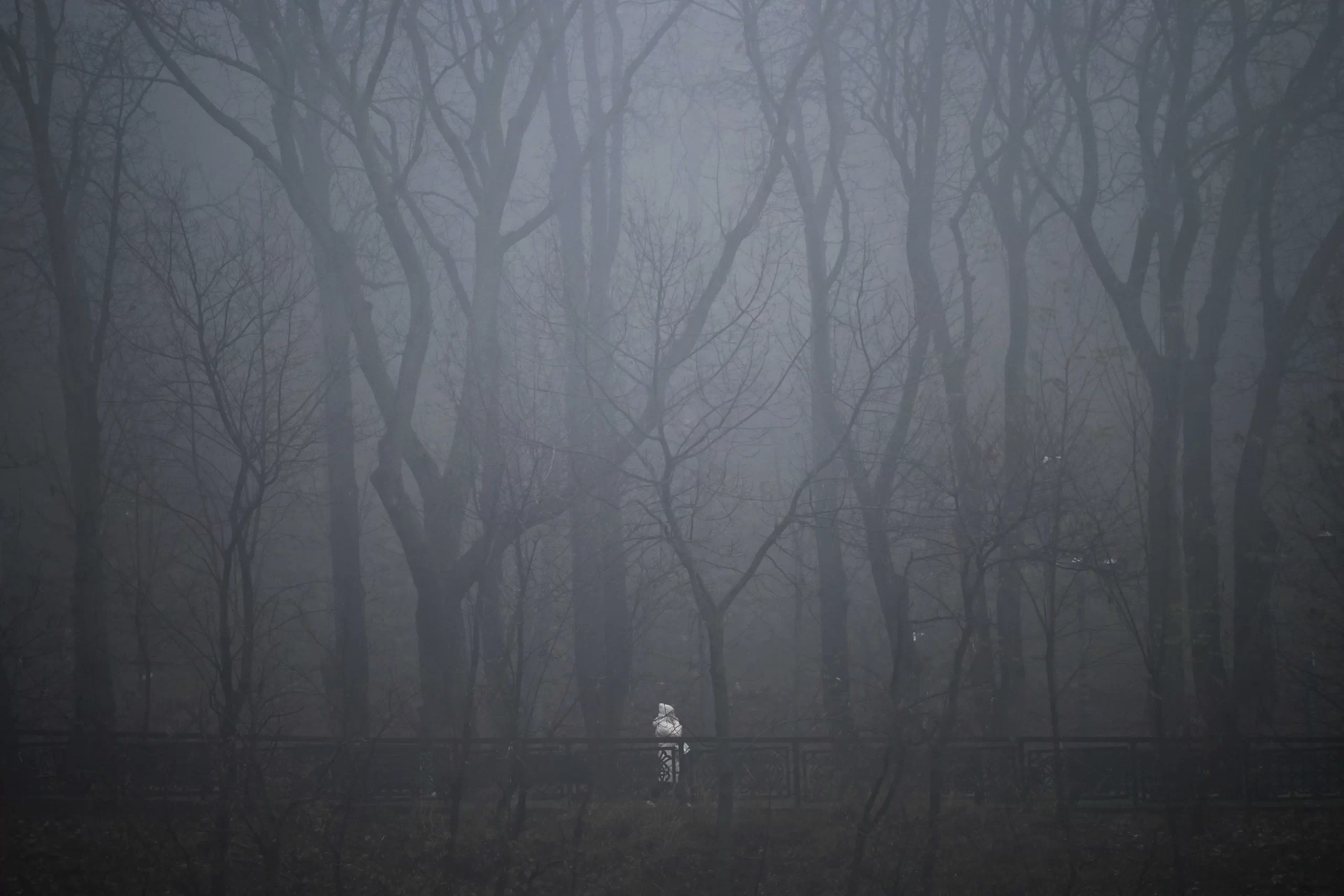 Žena prochází parkem během mlhavého dne v Kyjevě na Ukrajině, 21. listopadu 2025. (Sergei Gapon / AFP via Getty Images)