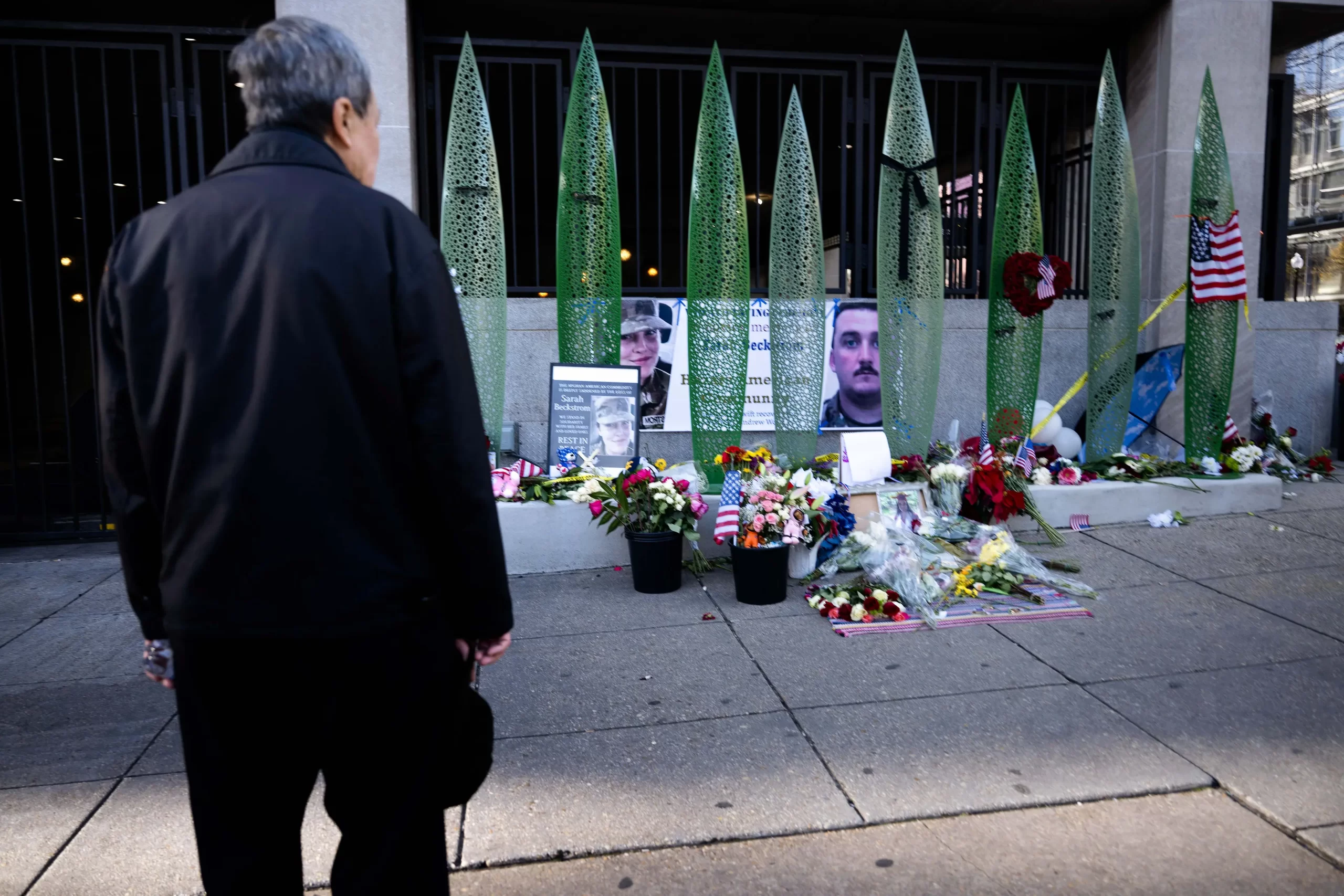 Muž si prohlíží pietní místo věnované obětem střelby na dva příslušníky Národní gardy ve Washingtonu, 1. prosince 2025. Dva vojáci Národní gardy, štábní seržant Andrew Wolfe a specialistka Sarah Beckstromová, byli 26. listopadu postřeleni poblíž Bílého domu při útoku, který úřady popsaly jako cílený čin afghánského migranta, jenž dříve spolupracoval s americkou armádou v Afghánistánu. Případ je vyšetřován jako teroristický útok. (Brendan Smialowski / AFP via Getty Images)