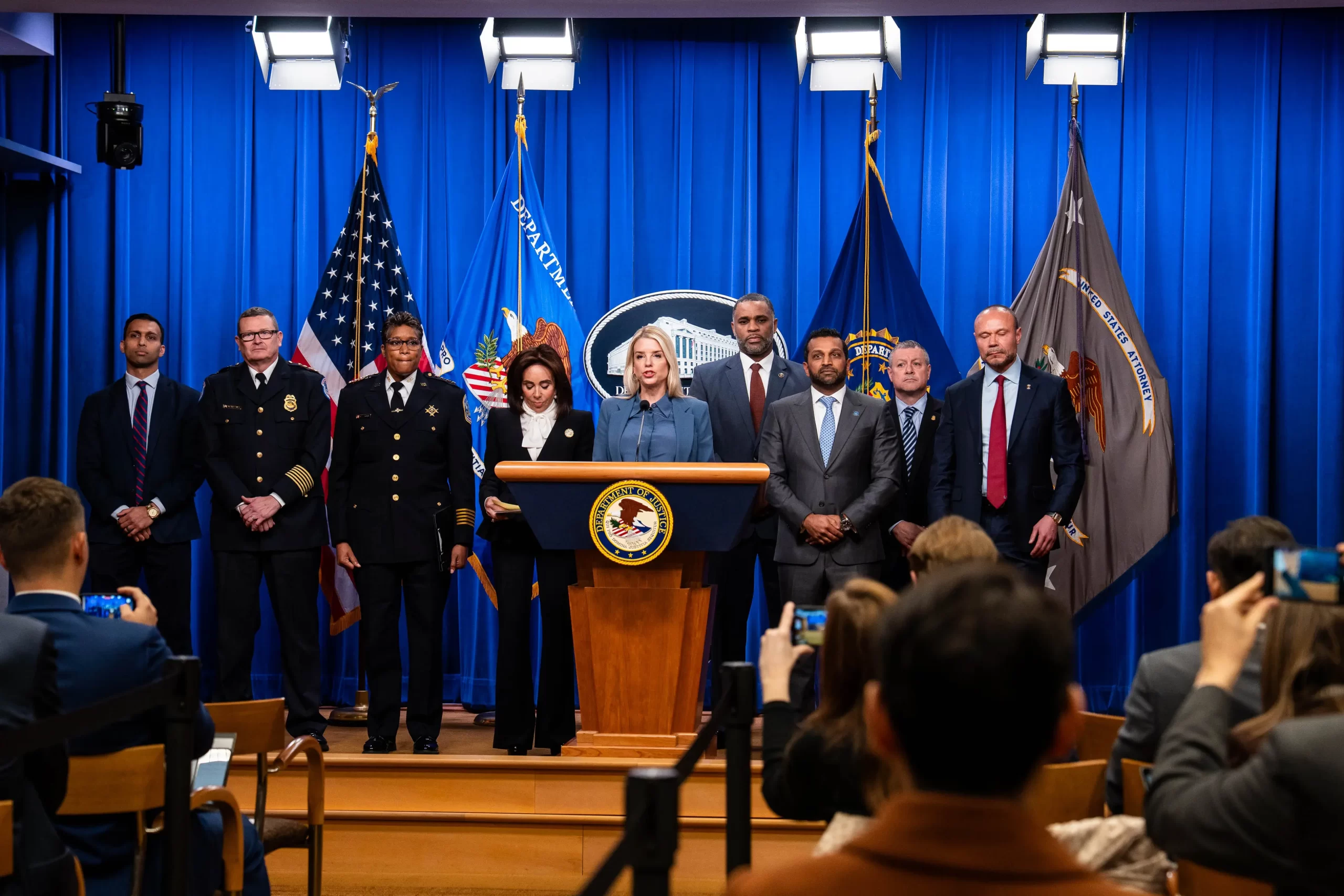 Generální prokurátorka Pam Bondiová, ředitel FBI Kash Patel a státní zástupkyně District of Columbia Jeanine Pirroová oznamují zatčení Briana Colea na tiskové konferenci ve Washingtonu, 4. prosince 2025. FBI vedla několik let trvající vyšetřování náloží umístěných ve Washingtonu 5. ledna 2021. (Madalina Kilroy / The Epoch Times)