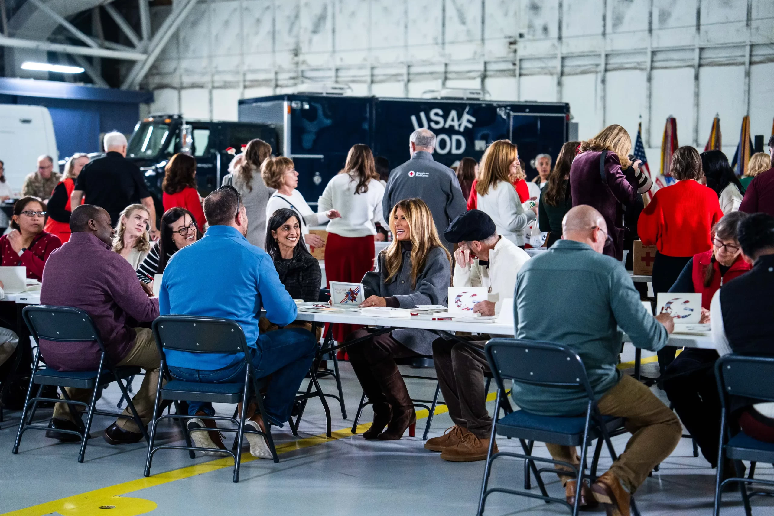 První dáma Melania Trumpová a druhá dáma Usha Vanceová hovoří s hosty během vánoční charitativní akce Červeného kříže na základně Joint Base Andrews v Marylandu, 1. prosince 2025. (Madalina Kilroy / The Epoch Times)