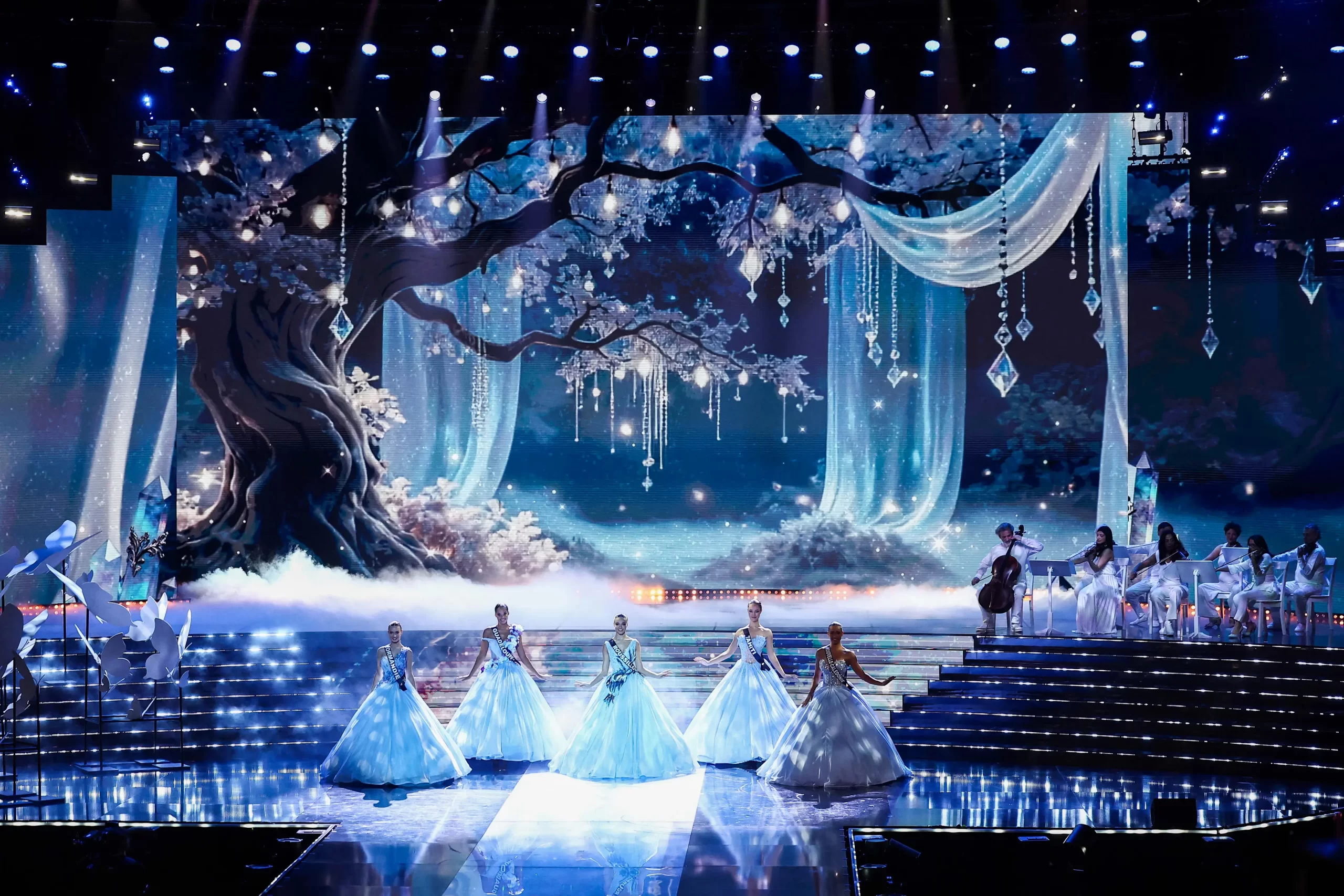 Pět finalistek soutěže Miss France 2026 vystupuje na pódiu v Zenithu v Amiens na severu Francie, 6. prosince 2025. (Sameer Al-Doumy / AFP via Getty Images)