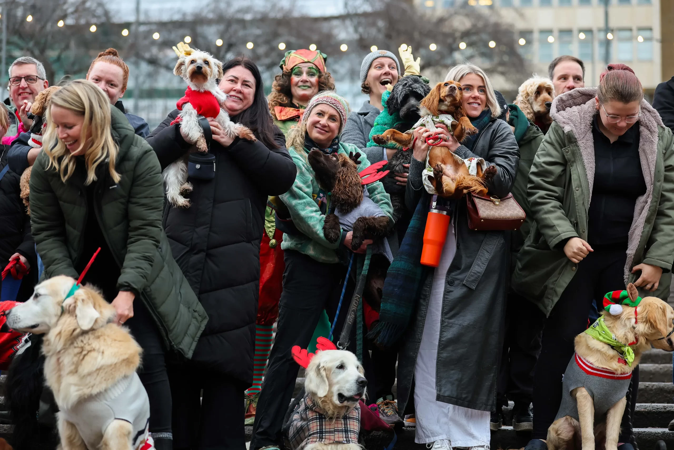 Více než sto psů v vánočních kostýmech se účastní akce Santa Paws v Edinburghu ve Skotsku, 7. prosince 2025, při pokusu o vytvoření světového rekordu. (Jeff J Mitchell / Getty Images)