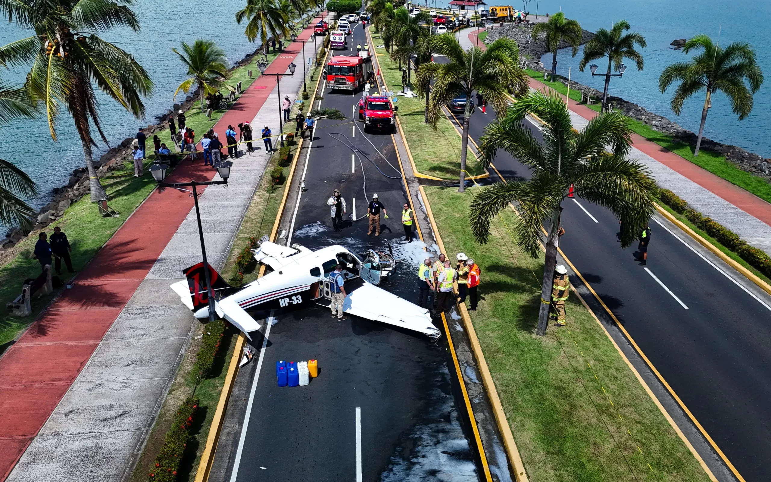 Letecký pohled na letoun Beechcraft Bonanza Model 33 po nouzovém přistání na hrázi Amador v Panamě, 11. prosince 2025. Úřady nehlásily žádné oběti a příčina nehody zůstává neznámá. (Mauricio Valenzuela / AFP via Getty Images)