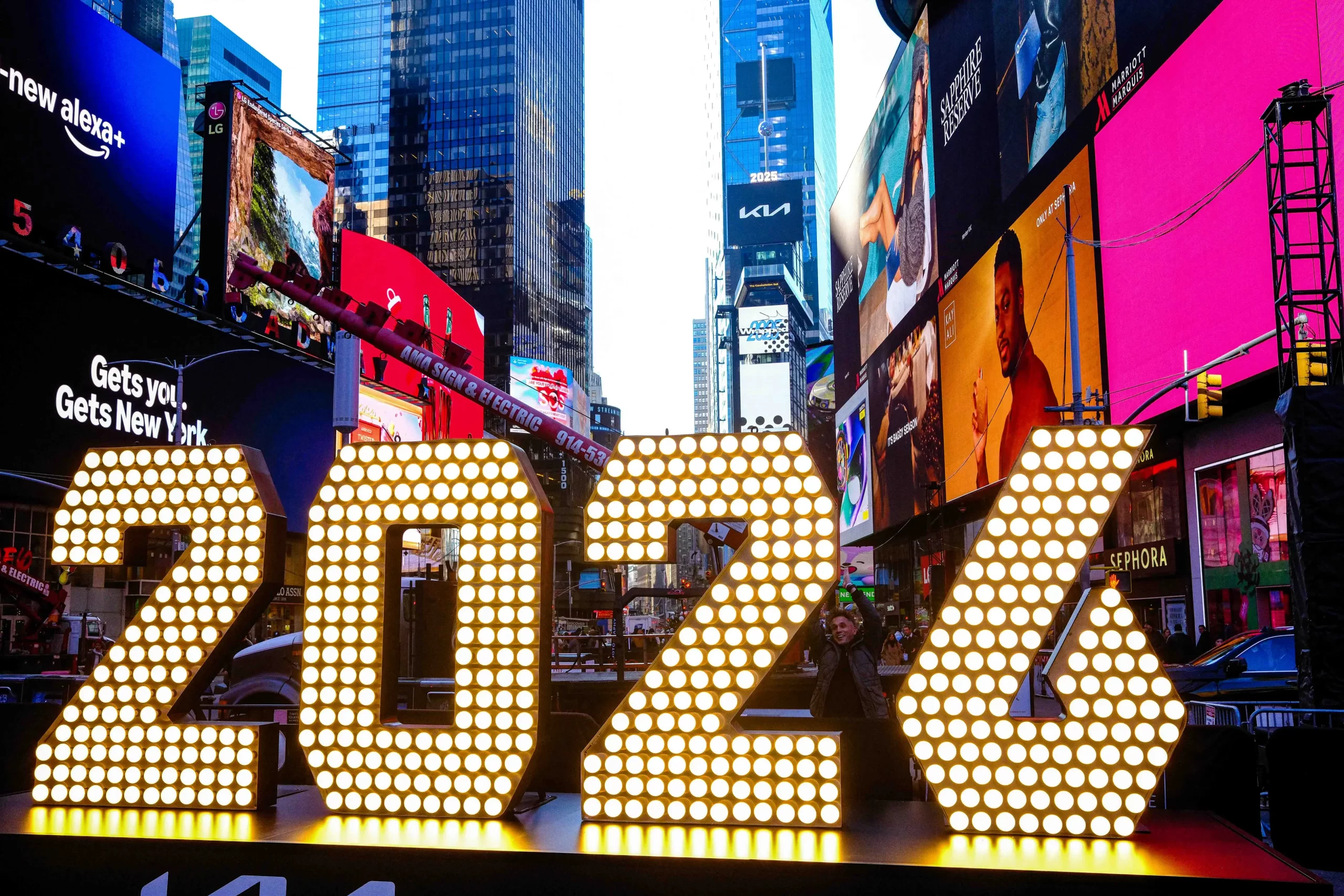 Sedm metrů vysoké číslice „2026“ jsou vystaveny po slavnostním rozsvícení na Times Square v New Yorku, 18. prosince 2025. Číslice budou použity při silvestrovském odpočítávání pádu koule. (Charly Triballeau / AFP via Getty Images)
