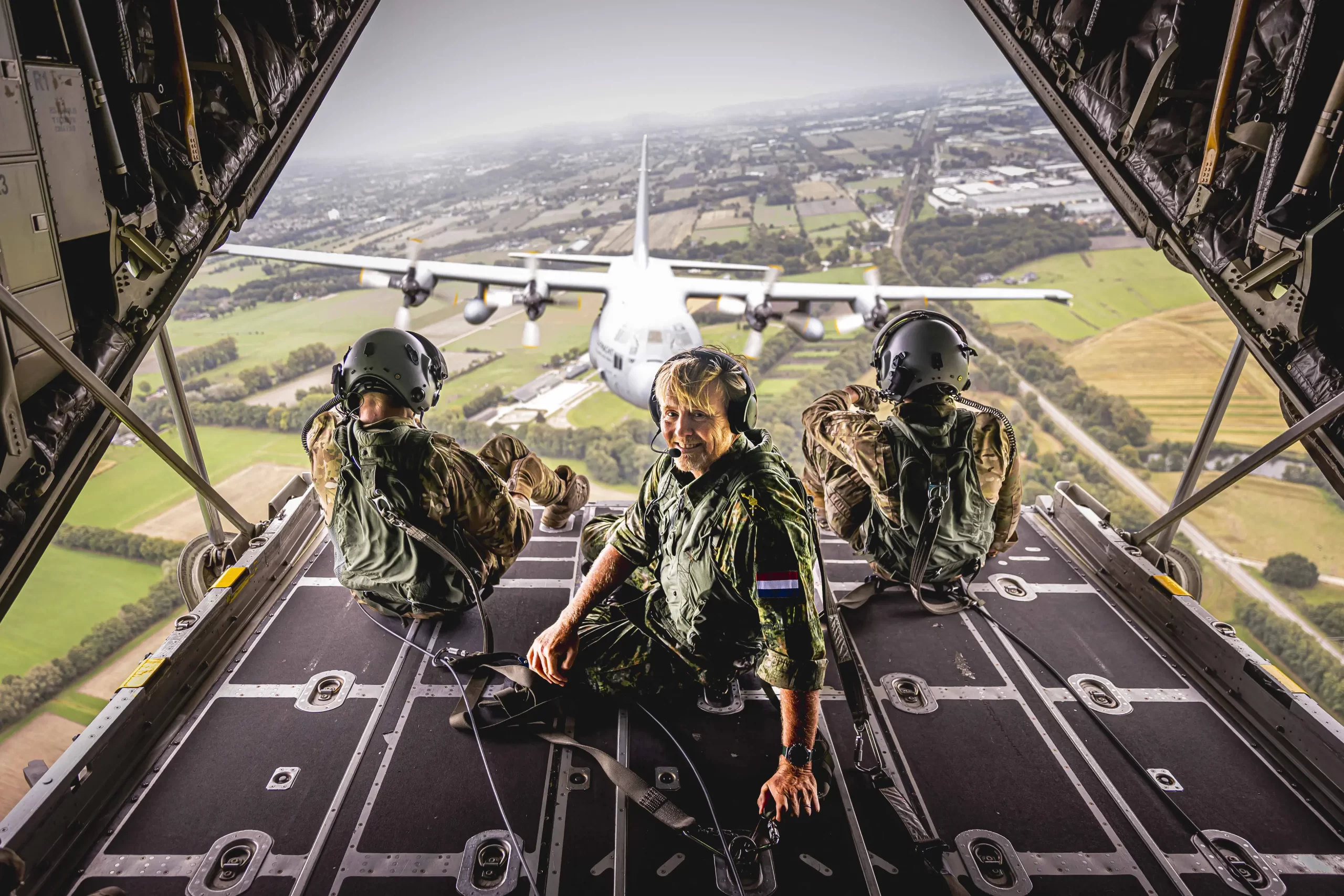 Nizozemský král Willem-Alexander sedí na rampě vojenského transportního letounu během mezinárodního výsadkového cvičení na letecké základně Eindhoven, 18. září 2025. (Patrick Van Katwijk / ANP / AFP via Getty Images)