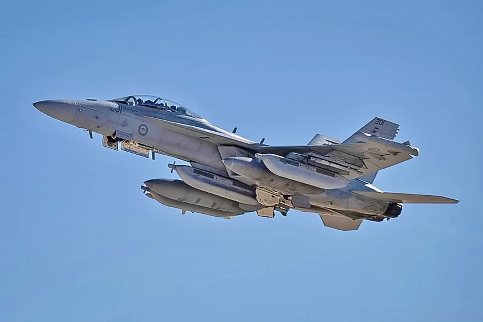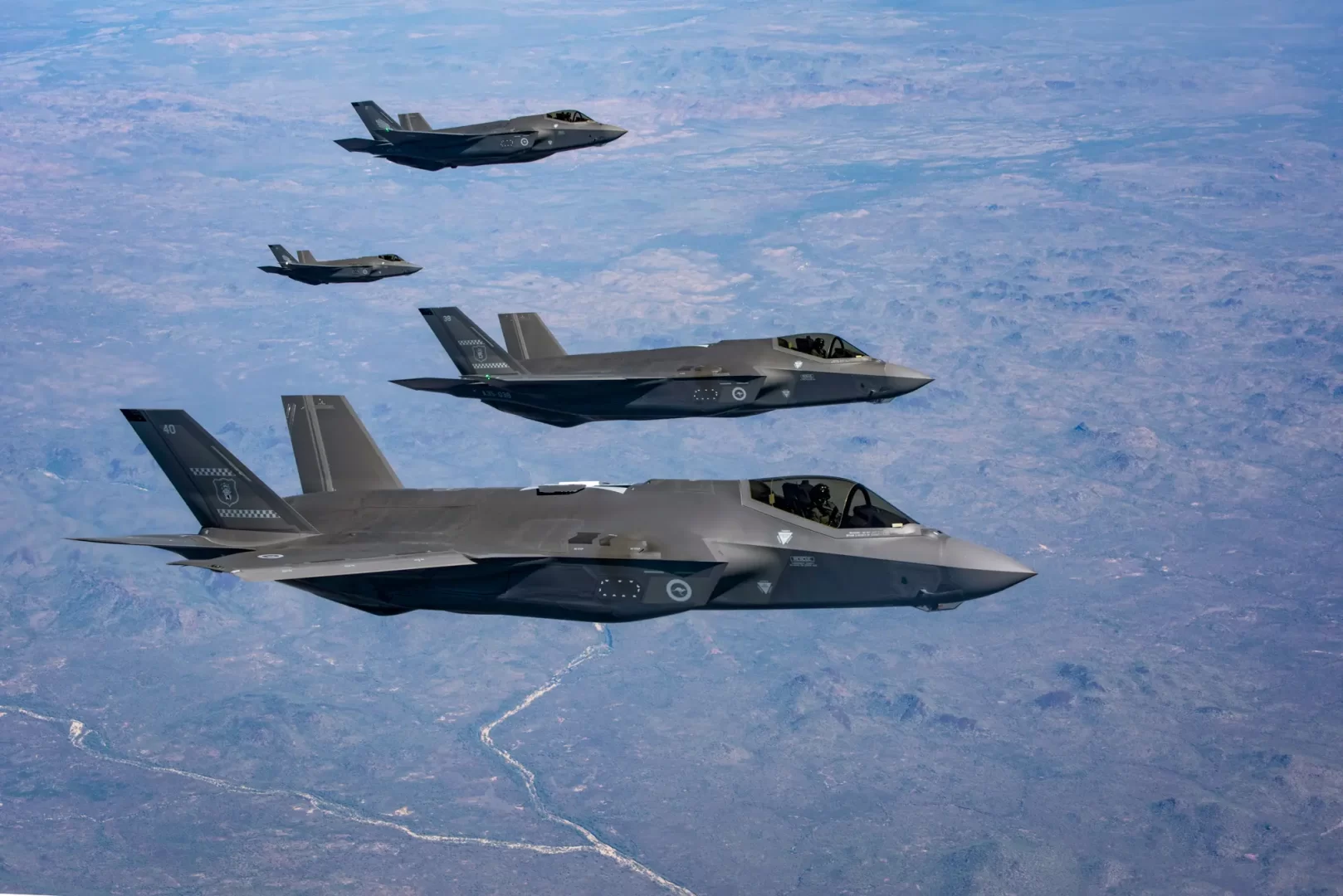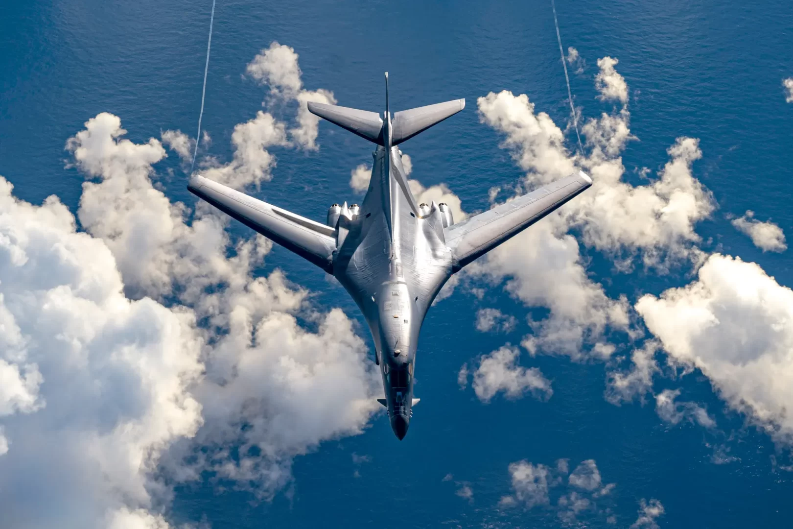 (Vlevo nahoře) Bombardér B-1B Lancer letí nad Tichým oceánem během mise Bomber Task Force 20. června 2022. (Vpravo nahoře) Stíhačky F-35A Lightning II Královského australského letectva doplňují palivo z víceúčelového tankeru KC-30A během cvičení Talisman Sabre 23 dne 23. července 2023. (Vlevo dole) Letoun EA-18G Growler Královského australského letectva startuje z letecké základny Amberley na misi během cvičení Red Flag 23-1 na základně Nellis v Nevadě 24. ledna 2023. (Vpravo dole) Letoun E-2C Hawkeye perutě včasné výstrahy VAW-120 letí nad Jacksonville na Floridě na archivním snímku. (Master Sgt. Nicholas Priest / U.S. Air Force; Tech. Sgt. Eric Summers Jr. / CC-PD-Mark; William R. Lewis / U.S. Air Force / Public Domain; Lt. j.g. John A. Ivancic / U.S. Navy)