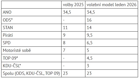 Hnutí ANO si v lednu podle autorů volebního modelu drží velký náskok. Získalo by stejný výsledek jako v říjnových volbách, po nichž sestavilo společnou vládu s SPD a Motoristy a odsunulo do opozice občanské demokraty, STAN, lidovce a TOP 09.