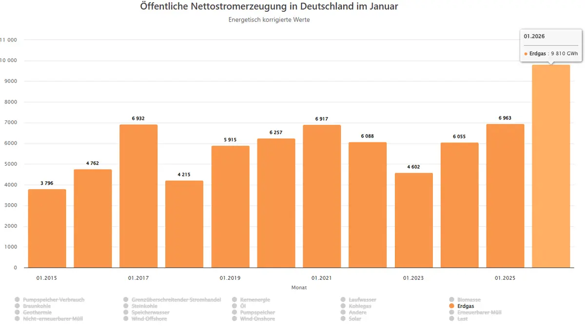Plynové elektrárny se v zimě stávají klíčovým nástrojem zajištění dodávek elektřiny. Patrné je to ze statistik spotřeby plynu pro výrobu elektřiny. Ta byla letos v lednu v EU meziročně vyšší o 23 procent, v Německu o 38 procent (v ČR dokonce o 78 %). Přestože Německo deklaruje odstup od uhlí, výroba elektřiny v lednu 2026 z uhlí je v podstatě stejná jako v týchž měsících dvou předchozích let. Jedním z překvapivých důvodů je pokles podílu výroby elektřiny z obnovitelných zdrojů energie ve výše zmíněných měsících.