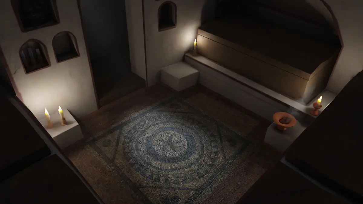Výzkumníci odkryli obvodové zdi mauzolea – monumentální hrobky –, které ve středověku pravděpodobně částečně rozebrali a použili jako stavební materiál. Dochovaly se i nejnižší stupně vstupního schodiště. Ve středu stavby leží vyvýšená mozaiková podlaha, pod níž se nachází druhá mozaika. Obě mají podobný motiv: centrální květ obklopený soustřednými kruhy a lemovaný dlaždicovým okrajem.