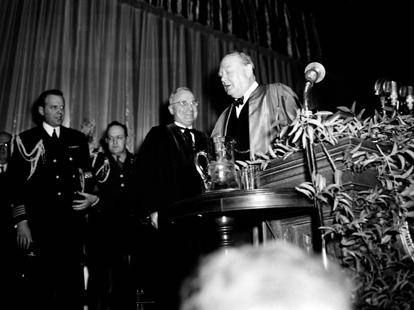 Již v květnu 1945 poslal Winston Churchill americkému prezidentovi Harrymu S. Trumanovi telegram, ve kterém poprvé použil termínu iron curtain – železné opony, pro popis sféry sovětského vlivu na východní Evropě. Při jeho slavném proslovu se tak nejednalo o žádné spontánní přirovnání.