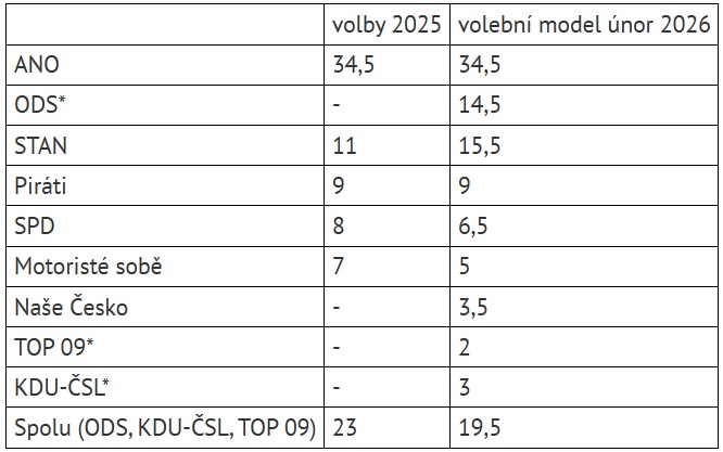 Hnutí ANO si v únoru vedlo stejně jako v lednu a podle autorů volebního modelu si drží velký náskok. Získalo by stejný výsledek jako v říjnových volbách, po nichž sestavilo společnou vládu s SPD a Motoristy.