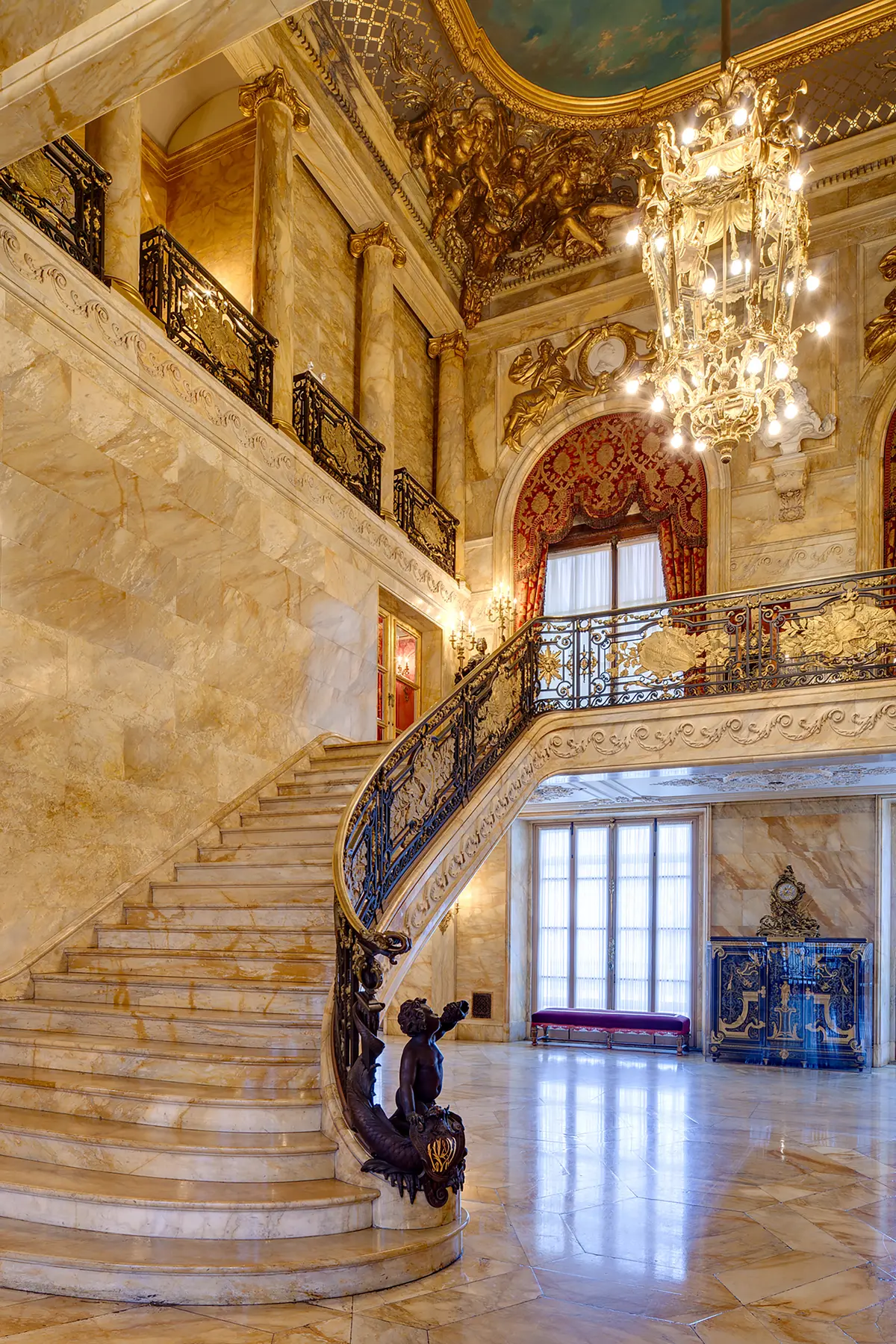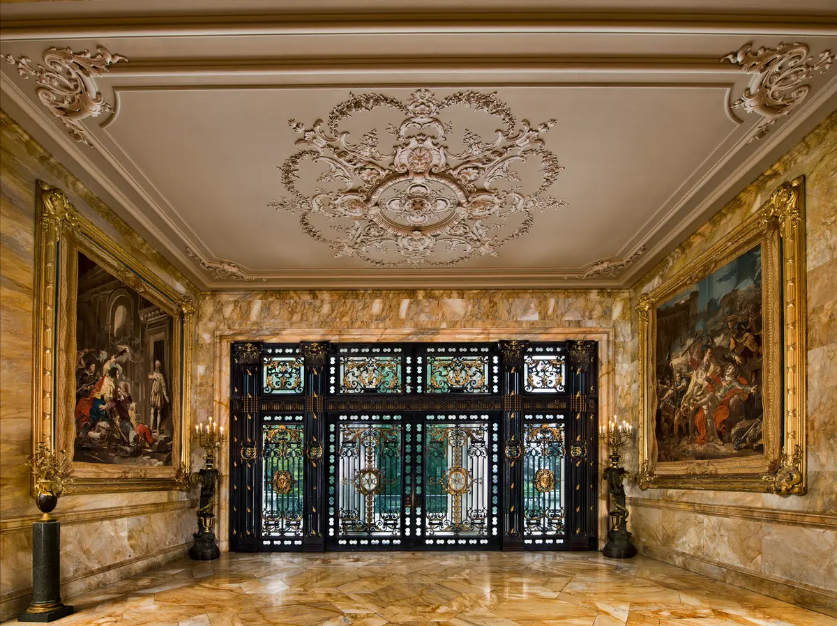 Po překročení prahu přes monumentální bronzové dveře vysoké přibližně 4,9 metru, z nichž každé váží asi 1 360 kilogramů, dává Marble House okamžitě najevo svou přítomnost. Každý detail svědčí o návrhu vytvořeném nejen k ohromení, ale i k trvalosti. Vstupní prostor rámují dvě tapisérie z konce 18. století z dílny Gobelins. Tyto mistrovské práce, tkané z vlny a hedvábí v pařížské manufaktuře Manufacture des Gobelins, zdobily po staletí nejvýznamnější rezidence světa. (The Preservation Society of Newport County)Velkolepé schodiště ve vstupní hale je zhotoveno z dovezeného žlutého sienského mramoru, se zábradlím z tepaného železa zakončeným pozlaceným bronzem. U jeho paty stojí bronzový putti neboli cherubín, motiv oblíbený u Ludvíka XIV., který se objevuje i v celém paláci ve Versailles. (The Preservation Society of Newport County)Bohatě zdobená jídelna je obložena růžovým numidským mramorem z Alžírska a doplněna architektonickými detaily z pozlaceného bronzu. Krb vychází z předlohy v Salon d’Hercule ve Versailles a věrně reprodukuje jeho typické motivy listů a lastur. Židle ve stylu Ludvíka XIV., čalouněné sametem v sytých odstínech protkávaným kovovými vlákny, váží jednotlivě přibližně 34 až 45 kilogramů. Byly natolik těžké, že hosté Vanderbiltových často potřebovali pomoc personálu, aby je mohli přesunout. (The Preservation Society of Newport County)Gotický salon má křížovou klenbu, dřevěné obložení stěn a filigránový lustr, což odráží středověkou a renesanční sbírku, pro niž byl navržen. Jeho vápencový krb vychází z krbu v domě Jacquese Coeura ve francouzském Bourges. Ornamentální výzdoba čerpá inspiraci z francouzských gotických interiérů, avšak s místním prvkem – mezi listovím jsou zakomponováni krabi a humři jako pocta přímořskému prostředí Rhode Islandu. (The Preservation Society of Newport County)Velký salon, známý také jako Zlatý salon, sloužil Vanderbiltovým jako taneční sál. Inspirován Galerií Apollóna v Louvru má vyřezávané dřevěné stěny pokryté více než 500 000 plátky oslnivého 22karátového zlata. Výjevy řeckých a římských bohů dohlížejí na prostor a ztělesňují krásu, bohatství a velkolepost, k nimž Vanderbiltovi směřovali. (The Preservation Society of Newport County)Ložnice je vybavena nábytkovým souborem ve stylu francouzské renesance, jehož středem je luxusní dvojlůžko zdobené ručně vyřezávanými mořskými nymfami z bukového dřeva a zakončené baldachýnem vysokým přibližně 5 metrů. Prostor doplňuje obraz benátského malíře Giovanniho Antonia Pellegriniho Minerva, bohyně moudrosti, přemáhá čas, vhodně zvolený pro ložnici Alvy, neboť Minerva zosobňuje intelekt, předvídavost a řemeslnou dovednost, které obdivovala. (The Preservation Society of Newport County)Čínský čajový pavilon, postavený v roce 1914, vychází z chrámové architektury 12. století a vyznačuje se vystupujícími žebry a střechou z terakoty v jadeitově zeleném odstínu se zahnutými okraji. Sloužil jako okrasné útočiště i místo společenských setkání. Interiér je obložen tmavým dřevem a pilastry nesou čínská přísloví, která Alva osobně vybrala, včetně: „Co se týče přehánění v řeči, nese s sebou celý vůz démonů.“ (The Preservation Society of Newport County)