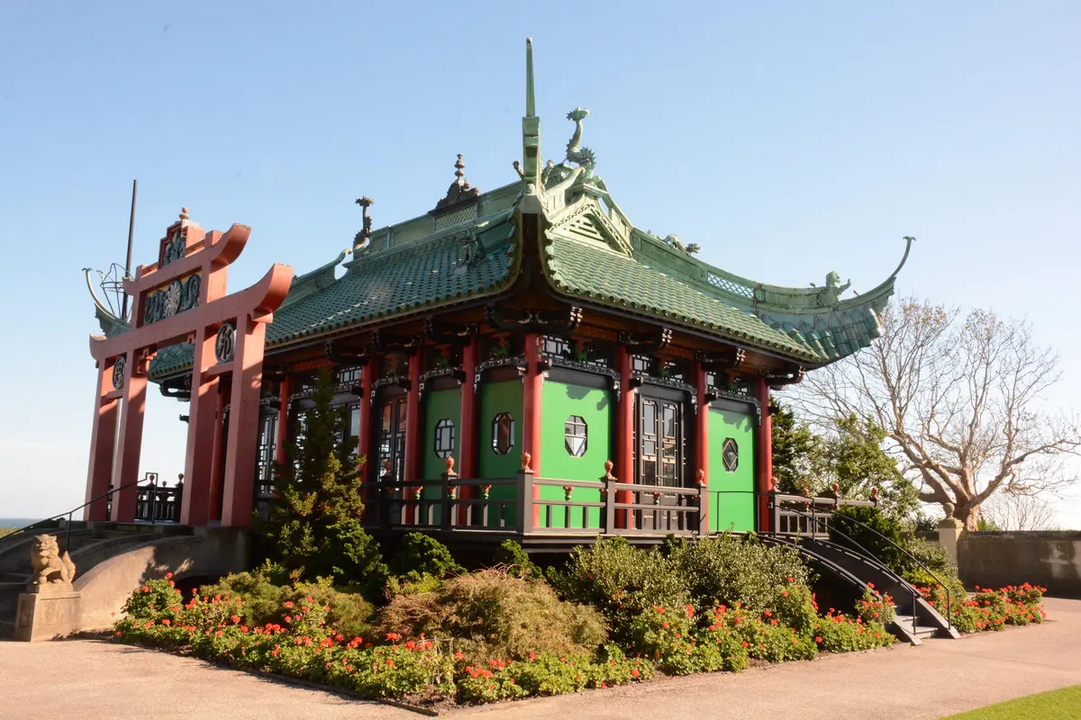 Zakřivená příjezdová rampa se zvedá k vystupujícímu vstupnímu portiku, kde čtyři mohutné kanelované korintské sloupy majestátně podpírají konstrukci, lemované po obou stranách kamennými balustrádami sledujícími ladný oblouk příjezdové cesty. Tentýž korintský řád – provedený se stejnou vytříbeností – zdobí i průčelí Petit Trianonu, jehož čtyři štíhlé sloupy vyjadřují zdrženlivou eleganci neoklasicistního stylu. (The Preservation Society of Newport County)