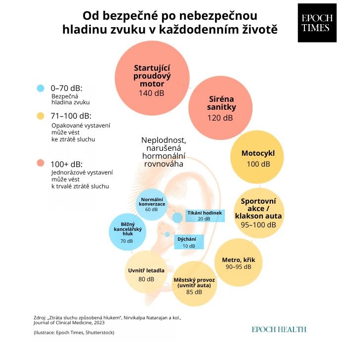 Pro představu: běžný rozhovor dosahuje přibližně 60 dB, zatímco rušná silniční doprava se pohybuje kolem 80 dB. Pokud hladina zvuku překročí 110 dB, začíná být poslech nepříjemný, a při hodnotách nad 130 dB se dostavuje bolest. Trvalý hluk nad 70 dB může mít za následek postupnou ztrátu sluchu, zatímco velmi silný hluk nad 120 dB může způsobit okamžité poškození, uvádí zpráva publikovaná v odborném časopise Journal of Clinical Medicine.