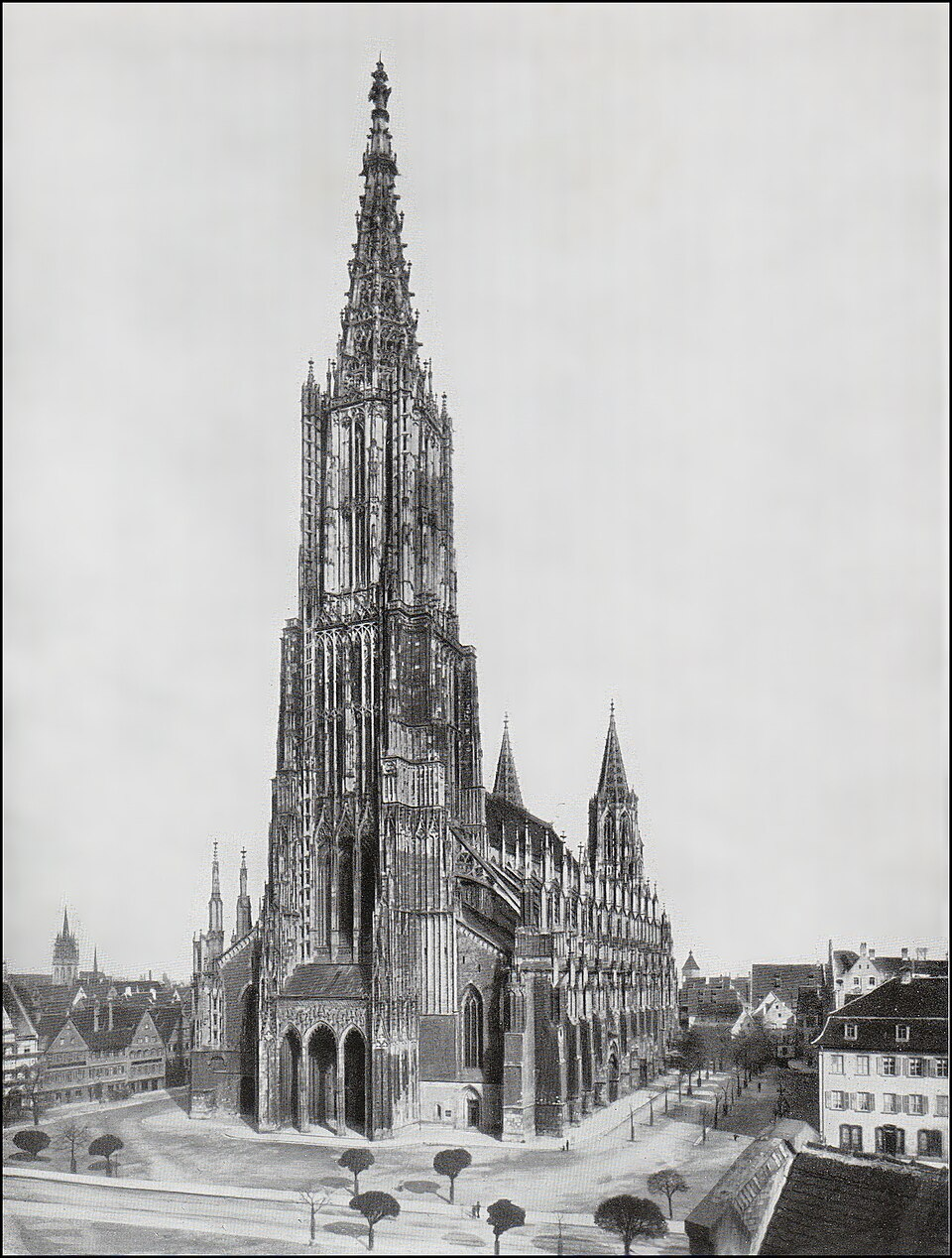 Až do dokončení hlavní věže Sagrady Famílie držel titul nejvyššího kostela světa po celých 136 let chrám v Ulmu. Jeho věž dosahuje výšky 161,53 metru a je vrcholným dílem německé gotiky. Základní kámen byl položen již v roce 1377 a stavba byla financována výhradně měšťany, nikoliv církví či šlechtou. Po dlouhých přestávkách a změnách v plánech byl chrám definitivně dokončen až v roce 1890.