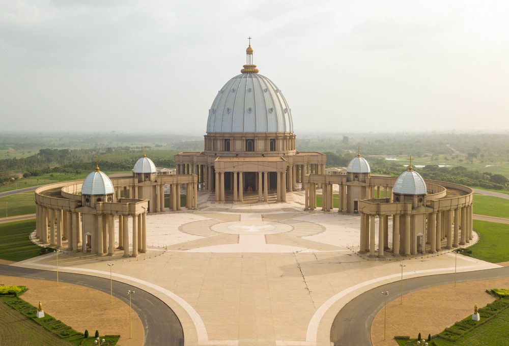 Letecký pohled na baziliku Panny Marie Královny míru v Yamoussoukru. (Liking Leba / Shutterstock)