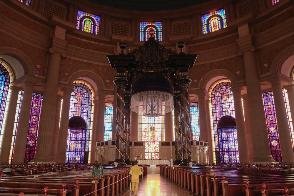 Interiér baziliky Panny Marie míru, nacházející se ve městě Yamoussoukro, za denního světla. (Dave Primov / Shutterstock)