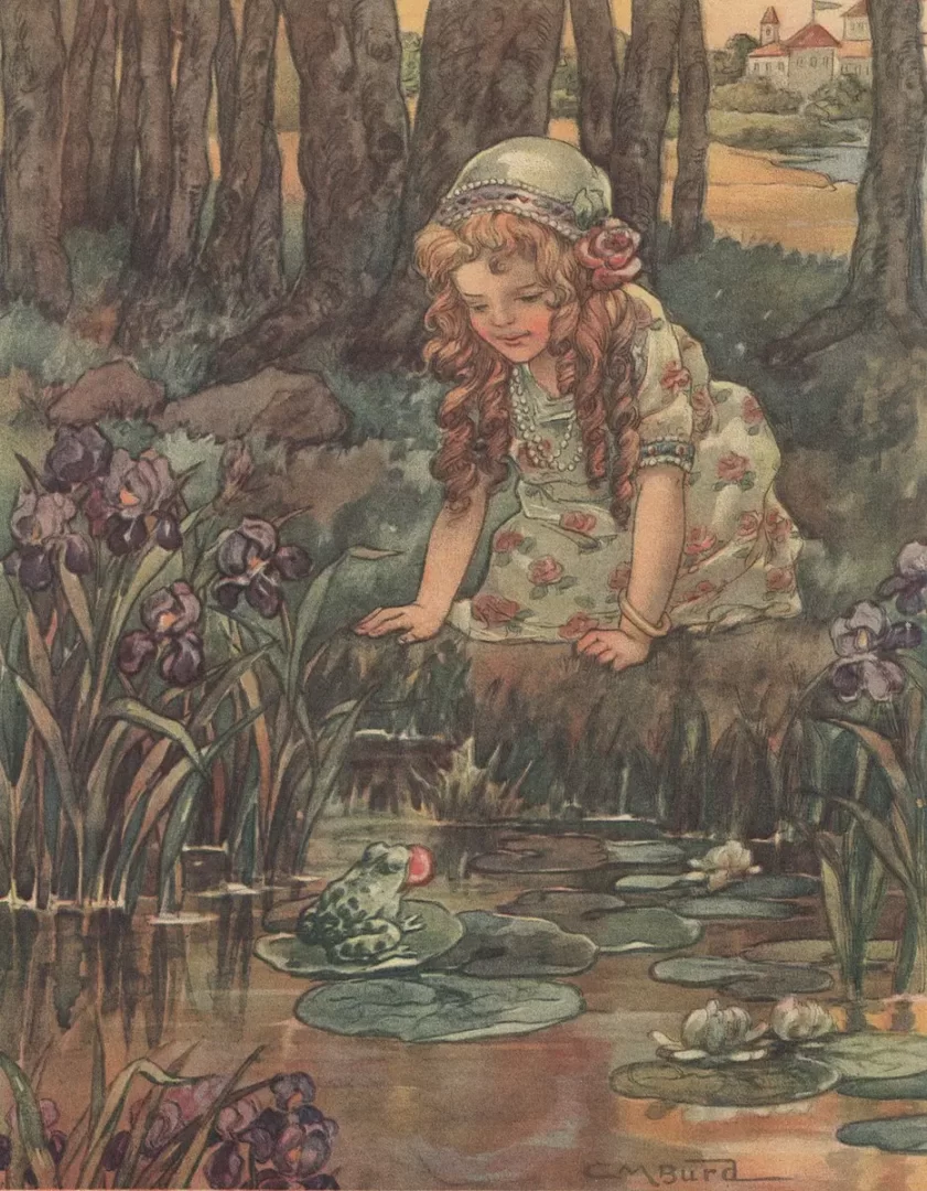 Uprostřed pláče však zaslechne laskavý hlas: „Co tě trápí, královská dcero? Pláčeš tak, že bys pohnula i kamenem.“ Princezna vzhlédne a uvidí žabáka, jak na ni hledí z vody.